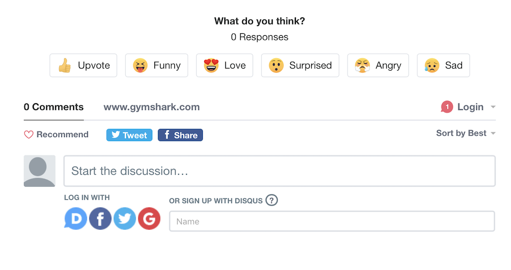 Gymshark macht das auf ihrem Blog. Der Kommentarbereich am Ende eines Beitrags enthält Emojis, sodass Leser superschnelles Feedback auf eine Weise geben können, mit der sie vertraut sind: