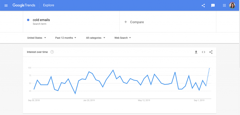 Sie können Ihr Thema auch mit anderen vergleichen (klicken Sie auf das Feld + Vergleichen). Im folgenden Beispiel habe ich „kalte E-Mails“ mit „Online-Geld verdienen“ und „freiberuflichen Schreibjobs“ verglichen. Die Ergebnisse zeigen, dass „Online-Geld verdienen“ viel beliebter ist, obwohl die anderen beiden für sich genommen beliebt sind.