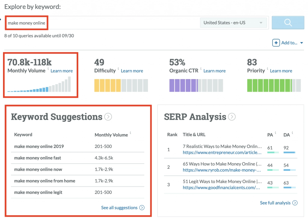 Google Trends ist ein hervorragender erster Schritt. Wenn es keine Zielgruppe gibt, benötigen Sie eine neue Nische. Durch Keyword-Recherchen erhalten Sie jedoch genauere und aktuellere Einblicke in Ihre Nische. Sie können verschiedene kostenlose Tools verwenden, z.B. KWFinder und Mozs Keyword Explorer.