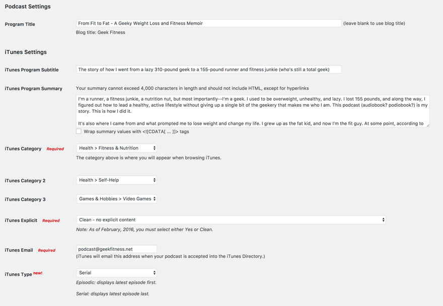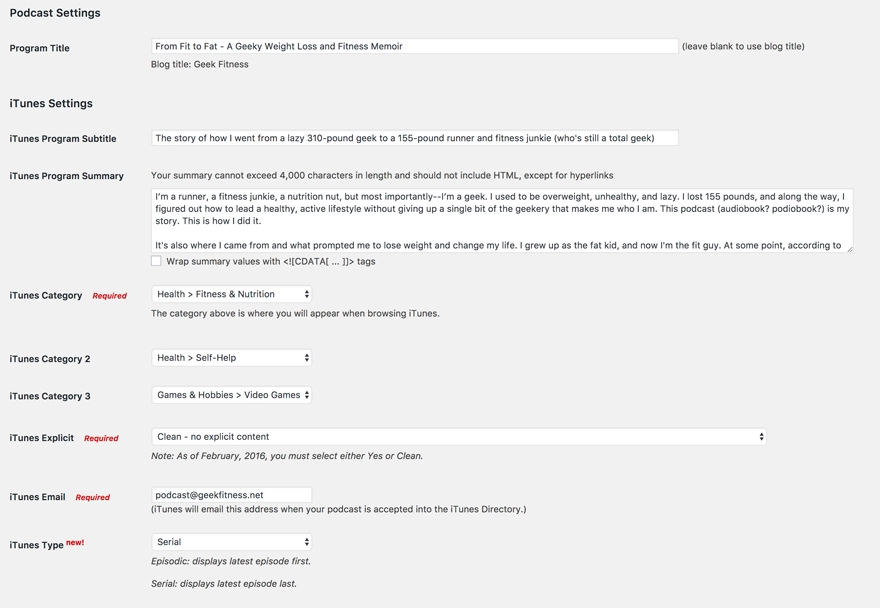Zunächst füllen Sie Ihre iTunes-Informationen unter der Überschrift Podcast-Einstellungen aus. Warum iTunes? Denn dort geht die überwiegende Mehrheit der Podcast-Hörer hin (und dort erhalten die meisten Podcast-Aggregatoren Ihren Feed). Sie möchten also, dass es so vollständig wie möglich ist.