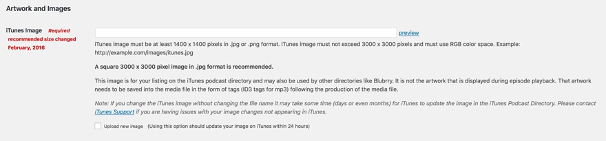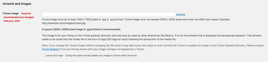 iTunes empfiehlt jetzt ein 3000 × 3000 JPG- oder PNG-Bild, das Sie in Ihre WordPress-Medienbibliothek hochladen und hier in PowerPress aufnehmen. Die Mindestanforderung ist 1400 × 1400, aber je höher die Auflösung, die Sie hier wählen, desto besser wird Ihre Show aussehen.