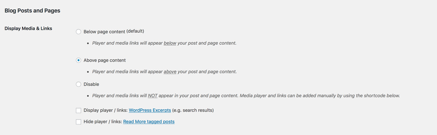 In den Blubrry PowerPress-Einstellungen können Sie festlegen, wo Ihr Media Player angezeigt werden soll. Die Standardeinstellung liegt unterhalb des Post-Inhalts, aber ich persönlich bevorzuge oben, da dies es für sie einfacher macht, frühzeitig auf Play zu klicken und dann Ihre Notizen zu lesen.