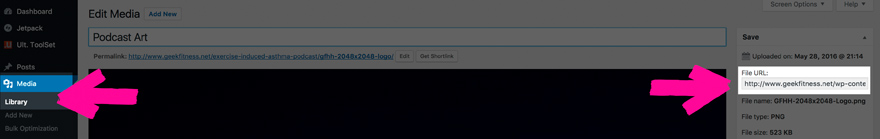 Sie müssen Ihre Grafik in Ihre WordPress-Medienbibliothek hochladen und den Dateinamen kopieren, um sie in das Feld „iTunes-Bild“ einzufügen.