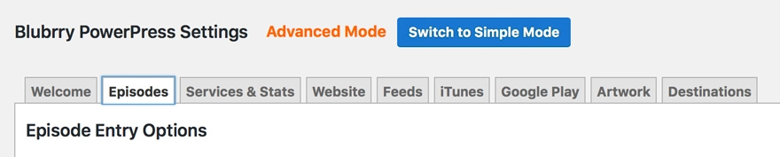 Aber wie benutzt man diese Tags? Nun, Blubrry hat diese bereits für Sie in PowerPress integriert. Um sie nutzen zu können, müssen Sie Ihre PowerPress-Einstellungen in den erweiterten Modus versetzen und dann auf die Registerkarte „Episoden“ klicken.